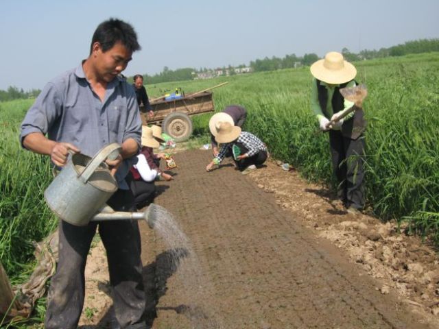 425下午,安徽省皖河农场双河分场种棉大户王长节正在钵床浇水,他聘请的“钟点工”忙着抢播棉种。至此,全场2万亩棉花播种接近尾声。根据节令,四月上旬就有棉农为棉籽下种准备营养土,中旬和下旬进入打钵抢种的高峰期。针对大批劳动力外出务工的情况,不少种棉大户购置了育苗压钵机,通过机械化方式打钵下种。今年是该场棉农享受棉种补贴的第二年,每亩发放价值15元的优质棉种,加上棉农自行选购,良种覆盖率达100%。
